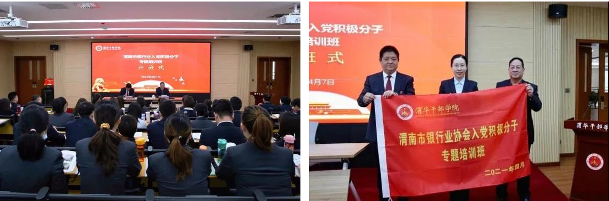 ? ? ? ?在慶祝建黨一百周年,開展黨史學(xué)習(xí)教育活動(dòng)之際,2021年4月6日—4月9日,為期4天的渭南市銀行業(yè)入黨積極分子專題培訓(xùn)班在渭華干部學(xué)院成功舉辦,渭南市銀行業(yè)85名入黨積極分子參加此次培訓(xùn)。開班式上,渭華干部學(xué)院副院長(zhǎng)王鋒向培訓(xùn)班班長(zhǎng)授旗并致歡迎辭,學(xué)員代表作表態(tài)發(fā)言,渭南市銀行業(yè)協(xié)會(huì)秘書長(zhǎng)王文常作動(dòng)員講話。
