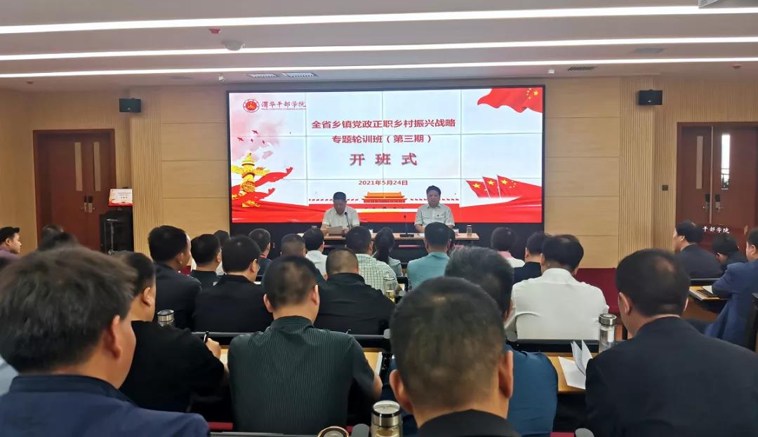 ? ? ? ?2021年5月24日,由陜西省委組織部舉辦的2021年全省鄉(xiāng)鎮(zhèn)黨政正職鄉(xiāng)村振興戰(zhàn)略專題輪訓(xùn)班(第三期)在渭華干部學(xué)院開班,全省部分鄉(xiāng)鎮(zhèn)(街道辦)黨(工)委書記和鎮(zhèn)長(主任)共50名學(xué)員參加了此次培訓(xùn)。渭華干部學(xué)院副院長王鋒主持開班式并致歡迎辭,渭華干部學(xué)院黨委副書記、常務(wù)副院長,華州區(qū)委常委、組織部長馬寧講話并向培訓(xùn)班班長授旗,學(xué)員代表作表態(tài)發(fā)言。