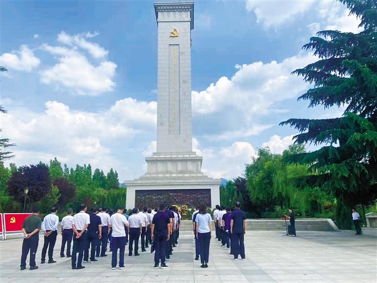 學(xué)員們?cè)谖既A起義烈士紀(jì)念碑前舉行“重溫入黨誓詞,緬懷革命先烈”活動(dòng)。