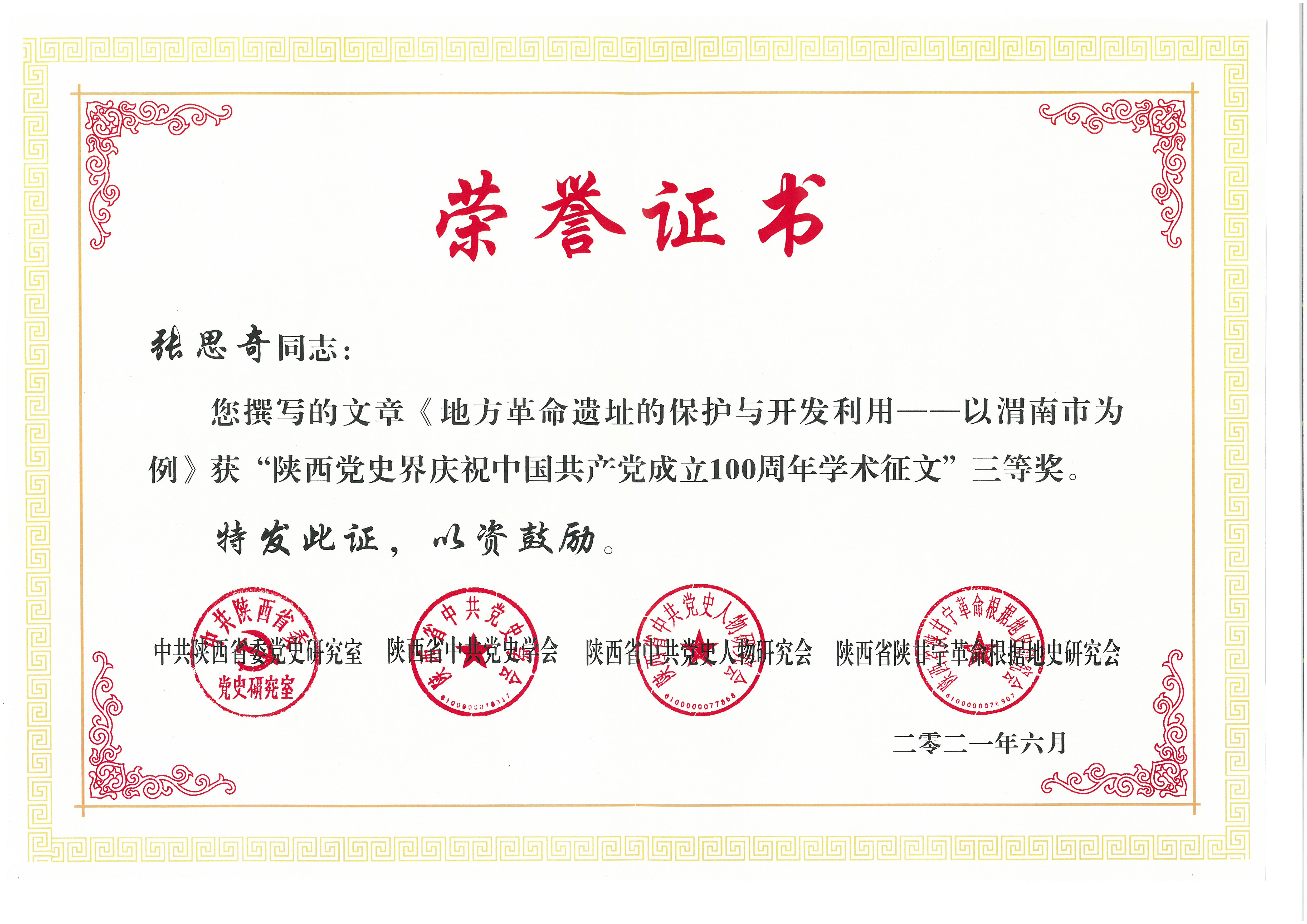 ? ? ? ?6月18日,中共陜西省委黨史研究室、陜西省中共黨史學(xué)會(huì)、陜西省中共黨史人物研究會(huì)、陜西省陜甘寧革命根據(jù)地史研究會(huì),聯(lián)合舉辦陜西黨史界慶祝中國(guó)共產(chǎn)黨成立100周年學(xué)術(shù)研討會(huì)在西安郵電大學(xué)長(zhǎng)安校區(qū)西區(qū)學(xué)術(shù)交流中心隆重舉行。中共陜西省委黨史研究室、陜西省社科聯(lián)、陜西省中共黨史學(xué)會(huì)、陜西省中共黨史人物研究會(huì)、陜西省陜甘寧革命根據(jù)地史研究會(huì)負(fù)責(zé)人及高校專(zhuān)家學(xué)者代表和征文活動(dòng)獲獎(jiǎng)作者代表共100余人參加會(huì)議。我院教務(wù)部老師張思奇參加會(huì)議,所撰寫(xiě)的《地方革命遺址的保護(hù)與開(kāi)發(fā)利用—以渭南市為例》學(xué)術(shù)論文榮獲三等獎(jiǎng)。