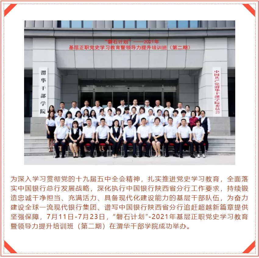 中國銀行陜西省分行“磐石計劃”-2021年基層正職黨史學(xué)習(xí)教育暨領(lǐng)導(dǎo)力提升培訓(xùn)班(第二期)在渭華干部學(xué)院成功舉辦