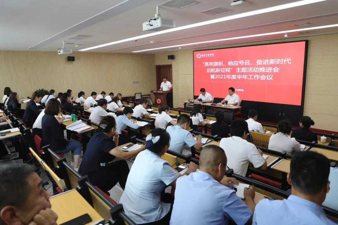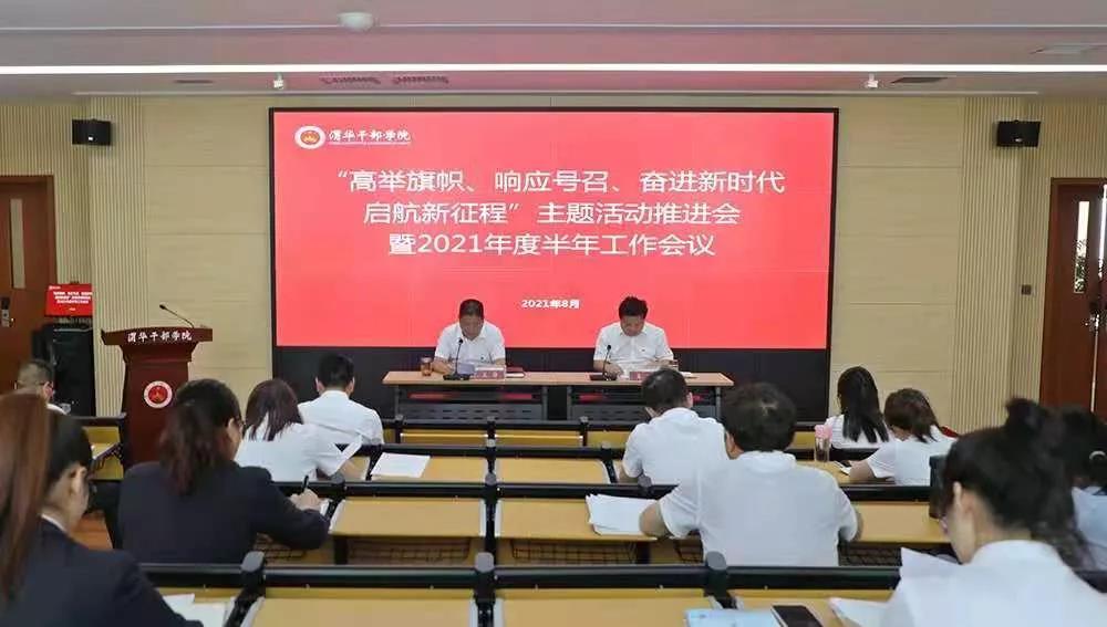 2021年8月19日,渭華干部學(xué)院召開“高舉旗幟、響應(yīng)號召、奮進新時代、啟航新征程”主題活動推進會暨2021年度半年工作會,會議由學(xué)院副院長王鋒同志主持,學(xué)院黨委副書記、常務(wù)副院長,華州區(qū)委常委、組織部部長馬寧同志出席會議并講話,學(xué)院全體教職工共60余人參加。會上宣讀了渭華干部學(xué)院“高舉旗幟、響應(yīng)號召、奮進新時代、啟航新征程”主題活動行動方案,對渭華干部學(xué)院“高舉旗幟、響應(yīng)號召、奮進新時代、啟航新征程”主題活動進行再動員、再安排、再部署。同時,回顧總結(jié)了學(xué)院2021年上半年工作,并對下半年工作進行了具體安排。