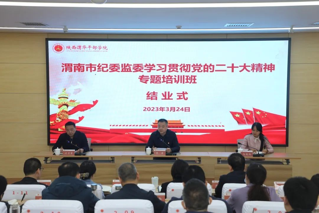 ? ? ? ?3月24日上午,培訓(xùn)班圓滿結(jié)業(yè)。結(jié)業(yè)式上,陜西渭華干部學(xué)院黨委副書記、常務(wù)副院長,渭南市華州區(qū)委常委、組織部長馬俊玲出席并為學(xué)員頒發(fā)結(jié)業(yè)證書。渭南市紀(jì)委副書記、市監(jiān)委副主任符浩作總結(jié)講話,他就落實好此次培訓(xùn)精神和不斷深化學(xué)習(xí)成效提出三點意見:一是要持續(xù)強化理論武裝,堅決捍衛(wèi)“兩個確立”、做到“兩個維護(hù)”;二是要牢牢把握職能定位,推動新時代新征程紀(jì)檢監(jiān)察工作高質(zhì)量發(fā)展;三是要充分發(fā)揮示范作用,錘煉忠誠干凈擔(dān)當(dāng)?shù)募o(jì)檢監(jiān)察干部隊伍。結(jié)業(yè)式由市紀(jì)委常委閆衛(wèi)軍主持。通過此次培訓(xùn),學(xué)員們一致表示:要以此次學(xué)習(xí)貫徹黨的二十大精神專題培訓(xùn)為契機,厘清工作思路,謀劃工作舉措,把學(xué)習(xí)收獲進(jìn)一步落實到做好本職工作上,推動黨的二十大精神轉(zhuǎn)化為強大工作動力,在實干中推動渭南紀(jì)檢監(jiān)察工作高質(zhì)量發(fā)展。