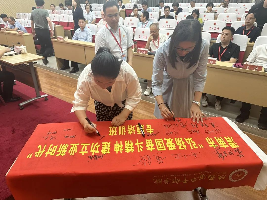 ? ? ? ?6月30日上午,培訓(xùn)班舉行結(jié)業(yè)式,結(jié)業(yè)式上學(xué)員代表作交流發(fā)言。渭南市人才發(fā)展中心主任李煒、渭南市人才發(fā)展中心人才招引和待遇落實(shí)科科長(zhǎng)屈戰(zhàn)海、陜西渭華干部學(xué)院辦公室主任韓寶林為學(xué)員代表頒發(fā)結(jié)業(yè)證書(shū),渭南市人才發(fā)展中心主任李煒作總結(jié)講話,全體學(xué)員在班旗上簽名留念,培訓(xùn)圓滿落幕。